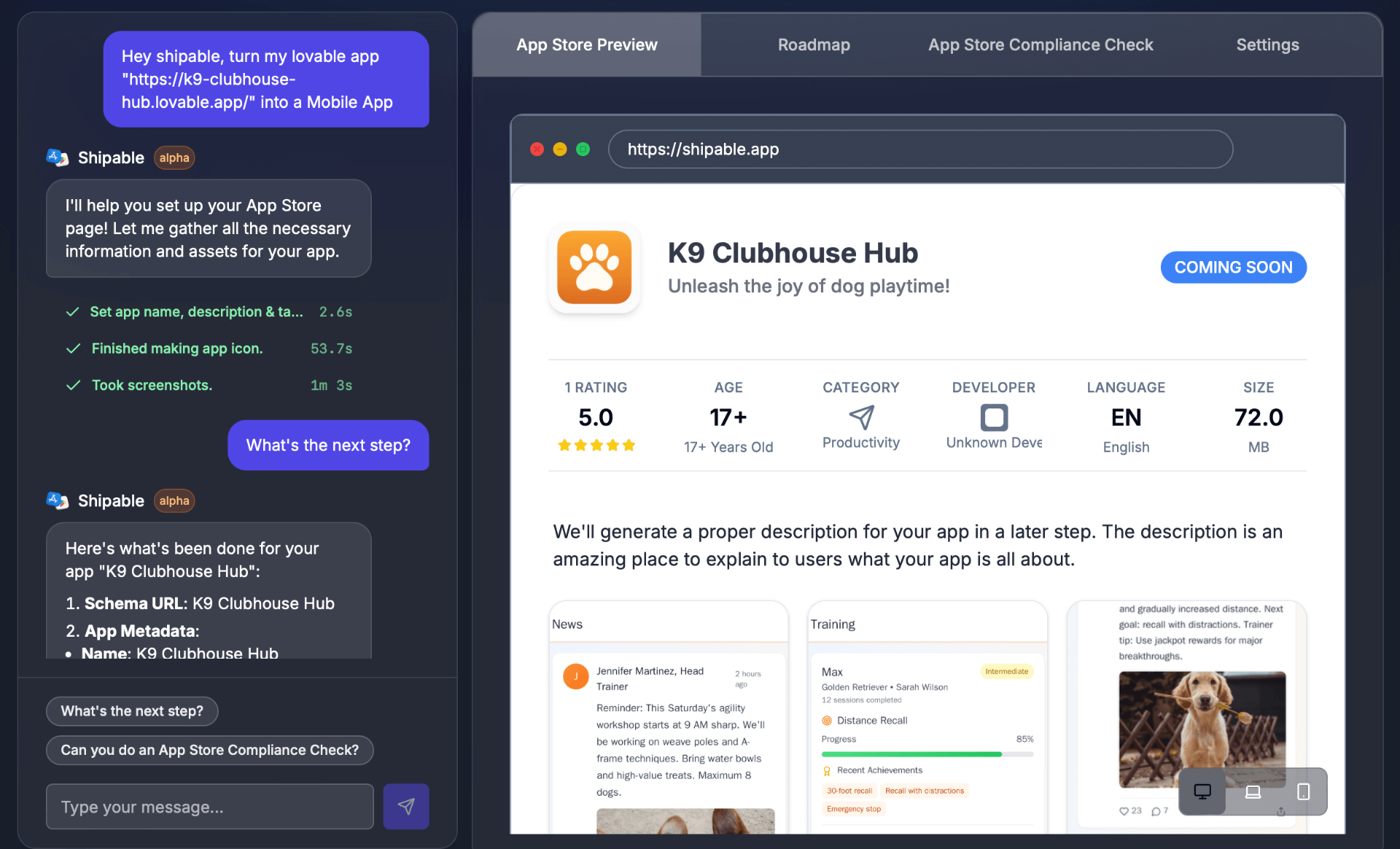 AI checks your app against store guidelines before submission.